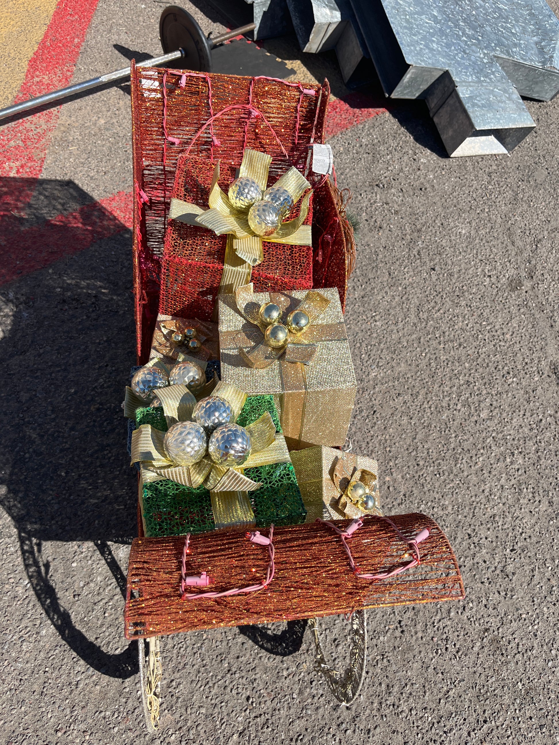 Ho ho ho. Nice full of packages yard decoration. Possibly can light up. Get ready for Christmas now. We also have a bunch of trees at great prices