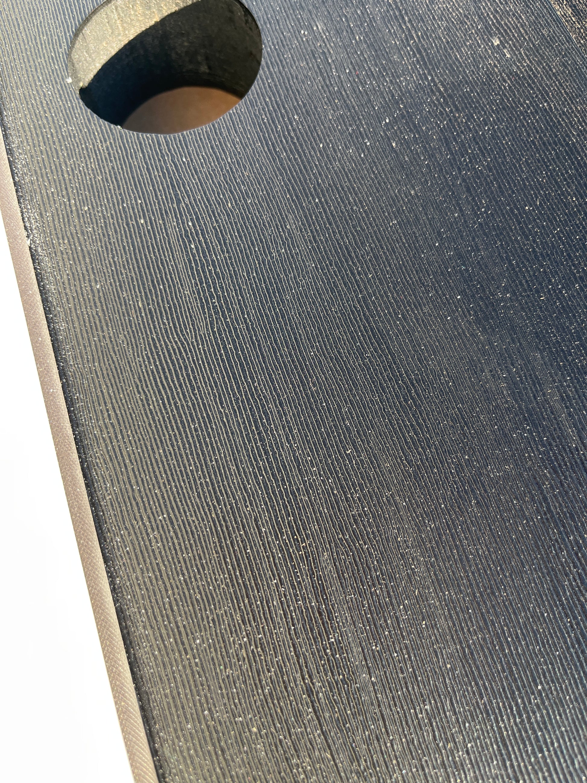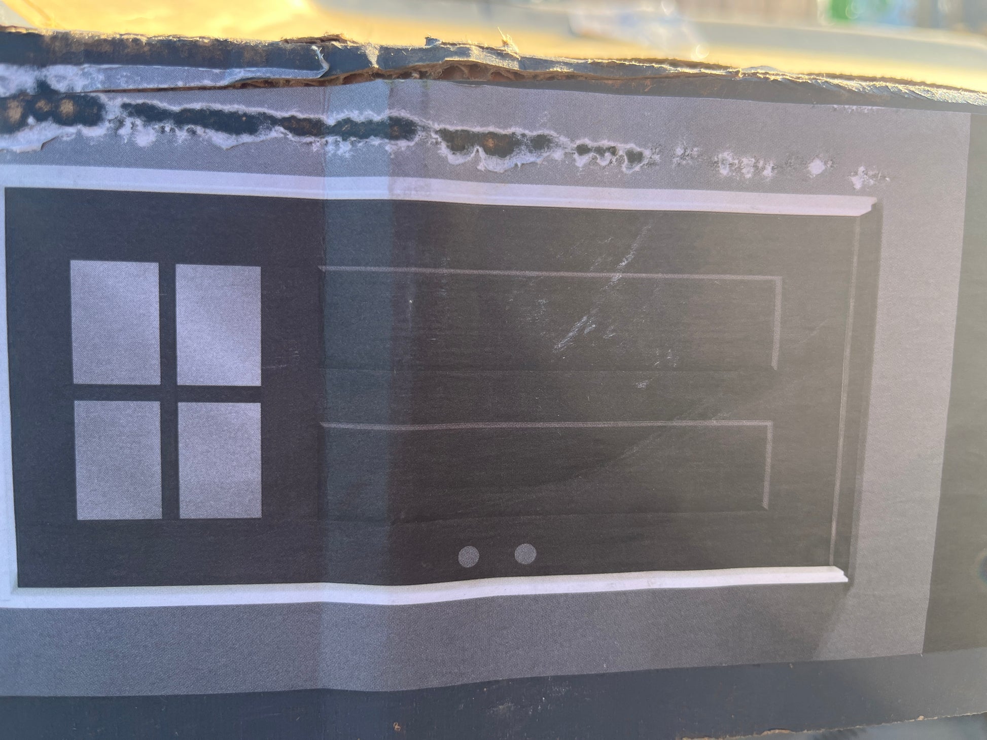 Fiberglass. Brand new. Four light window. Brown textured material. Very nice door. Has the look of real wood. Ball bearing hinges. Extra security on door knob places